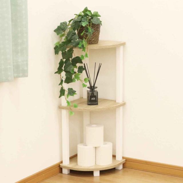 お部屋の隅にフィットしやすいデザインになっております。リビングでインテリアや日用品の収納に、トイレ個室に置いてロールペーパーやウェットタオル置きに、また玄関に置いて小物や消毒液タンク置きにも便利です。省スペースに場所を選ばず設置できます。