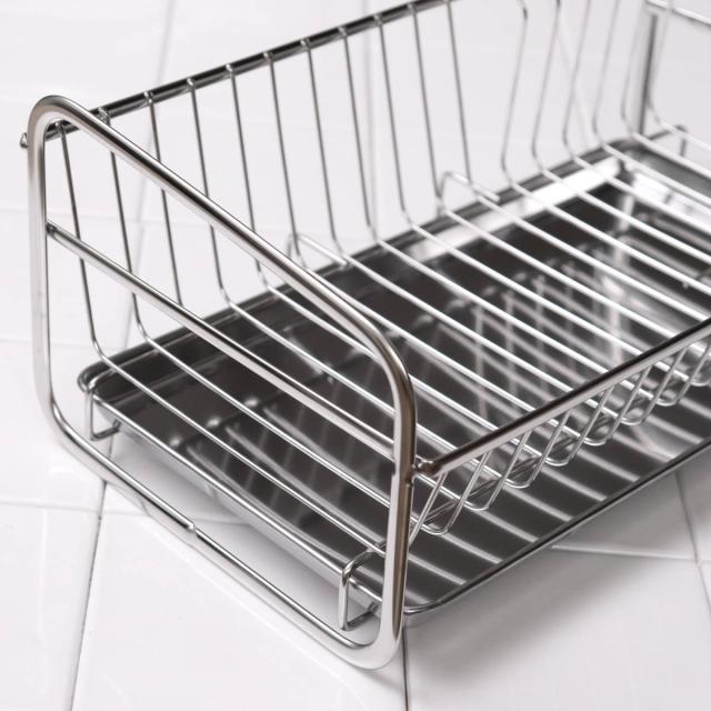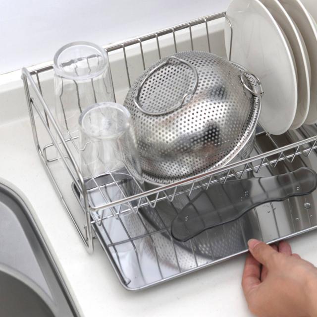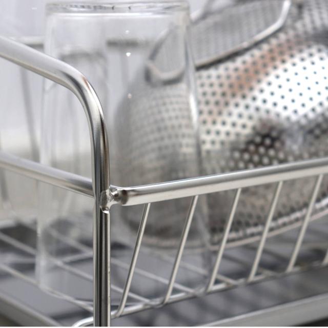 本体、水受けトレーともに、サビにくく丈夫なステンレス製です。汚れの溜まりやすいワイヤーの交差を減らした仕様になっており、洗いやすくいつも清潔にお使いいただけます。