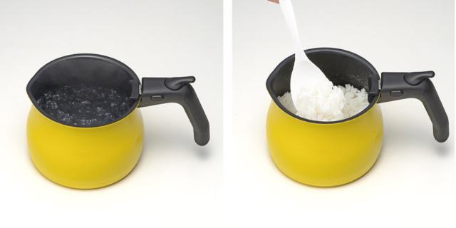 | ケトル代わりに 熱伝導率がよいので、コーヒー1杯分のお湯もサッと沸かせます。最大約2.2Lなので、やかんとしても十分な容量。注ぎ口つきで移し替えも楽々です。 | 少量の炊飯に 浸水をしたお米を加熱して蒸らすだけで手軽に炊き上がります。Mサイズなら2合まで対応。ご飯を少量しか炊かないご家庭やお弁当分をちょい足したい場合にもおすすめです。 |