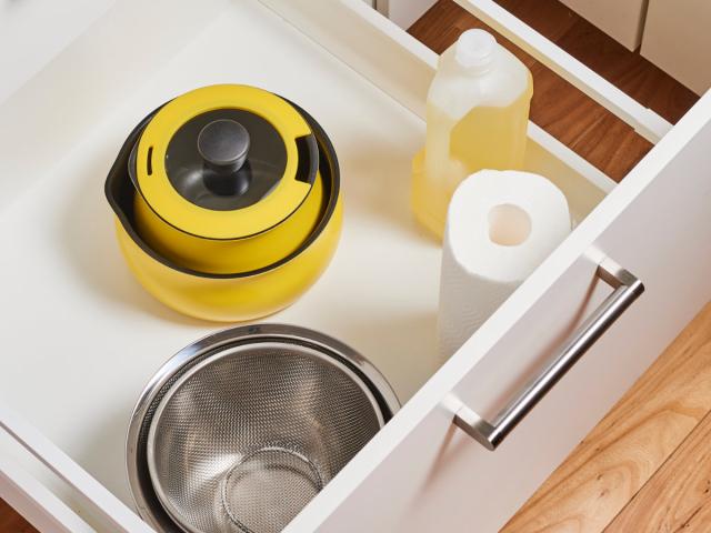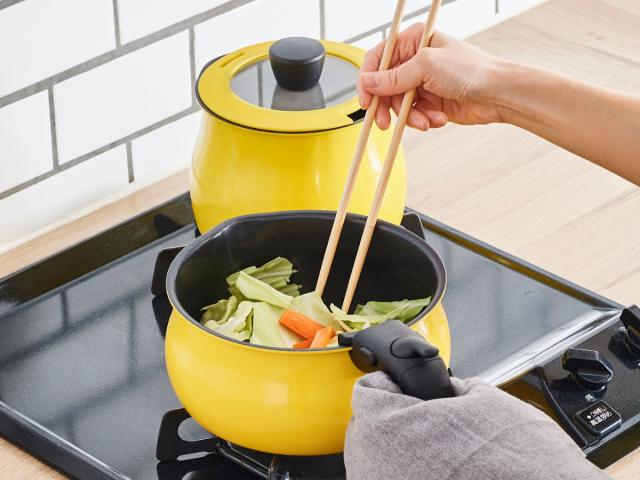 マルチポットとマルチパンは重ねてスッキリしまえます。取っ手もポットの中にしまえるので、引き出しの中でも引っ掛からず邪魔になりません。