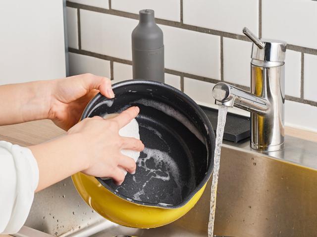 鍋の内側はふっ素樹脂加工が施されています。コゲつきにくく、汚れもスルッと落とせます。鍋本体は食洗機にも対応しています。