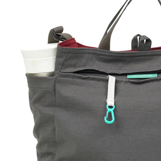 ジッパーポケットの内側には便利なキークリップ付きです。両サイドのポケットは水筒や折り畳み傘の収納にピッタリです。