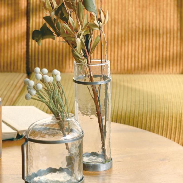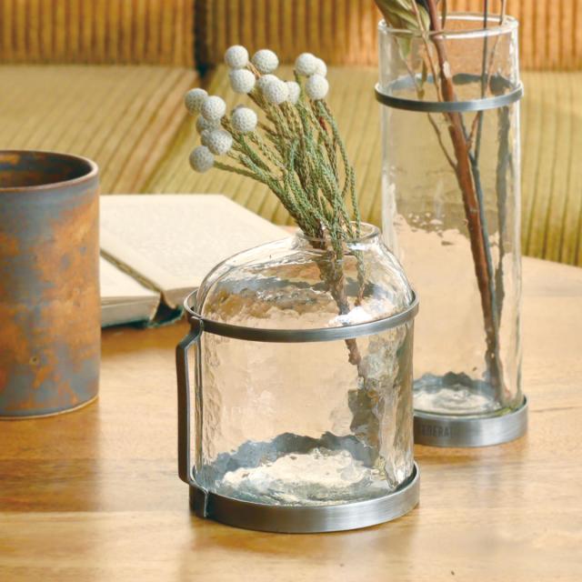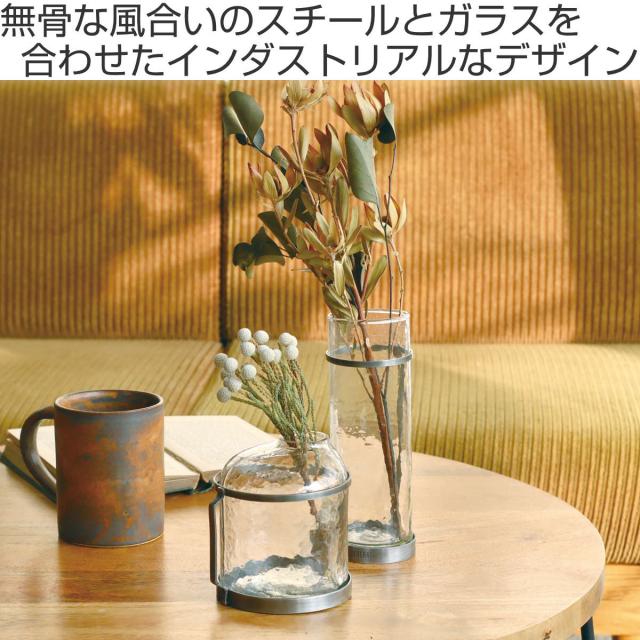 無骨な風合いのスチールとハンマートーン仕上げのガラスを合わせたフラワーベースです。インダストリアルなインテリアやクールな印象を与えたい空間の演出にぴったりです。