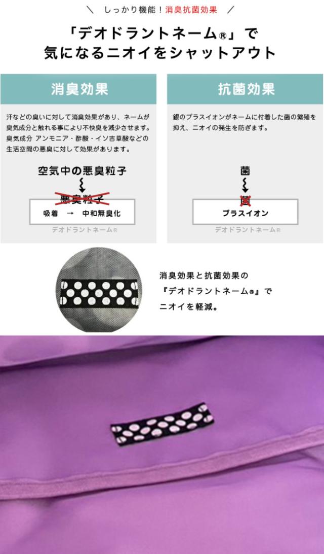 消臭&抗菌性効果に優れたデオドラントネームが付いているので、清潔にお使いいただけます。