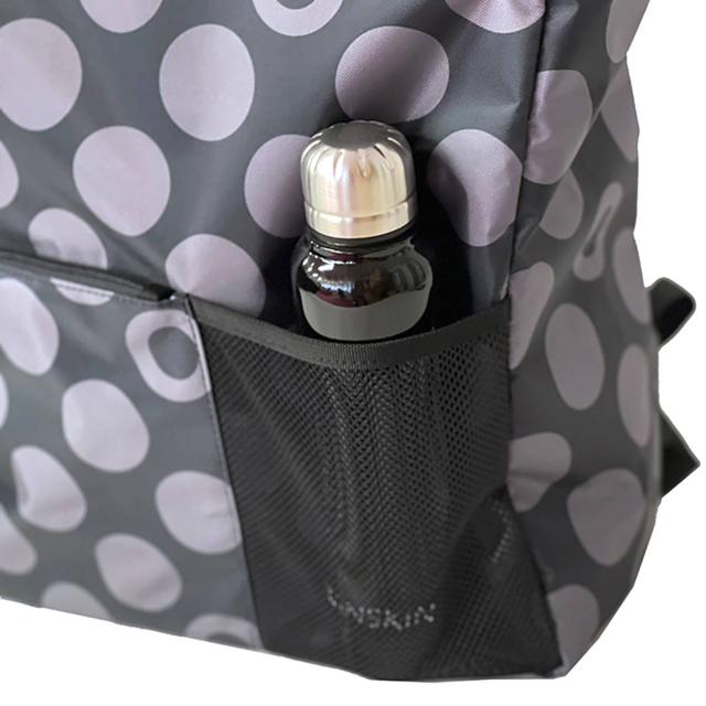 前面にはファスナーポケットとメッシュオープンポケットの2つのポケットがついています。小物類は飛び出す心配がないファスナーポケットに、すぐに取り出したい水筒はメッシュポケットに入れるなど、使い分けができます。