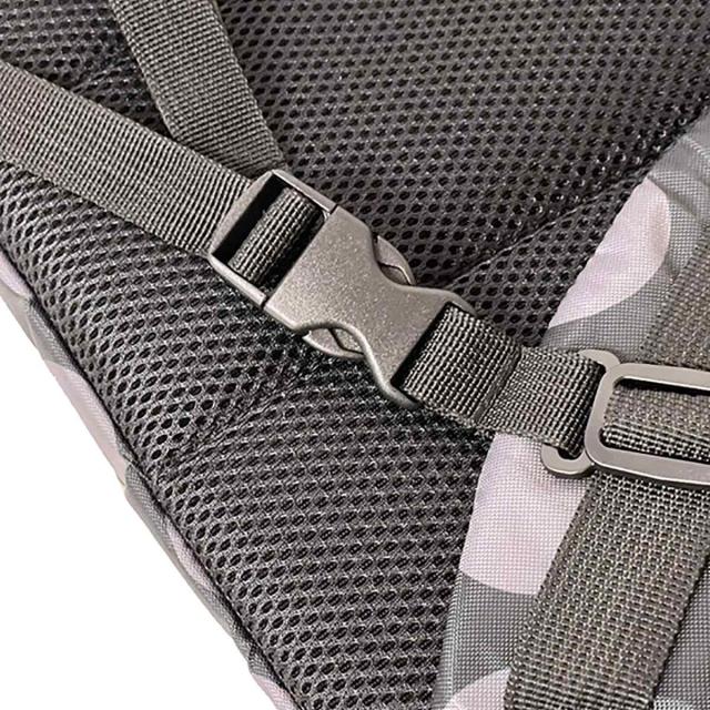 しっかり厚みのある肩紐は幅広仕様です。肌にあたる部分は通気性の良いメッシュ素材で、重い荷物を背負っても疲れにくいクッション加工がされています。長さ調節も可能です。