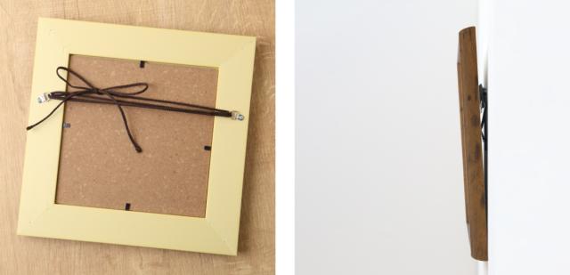 吊り金具付きのフレームです。フレーム裏面の吊り金具に付属の紐を結び、壁掛け金具に掛けて壁の好きな位置に飾れます。