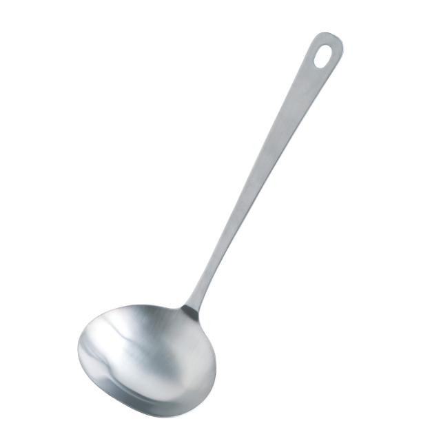 鍋の底や側面にフィットする楕円型のお玉です。皿部の幅が広いためスープなどがすくいやすく、丸型のお玉よりも注ぎたいところから注ぎやすくなっています。