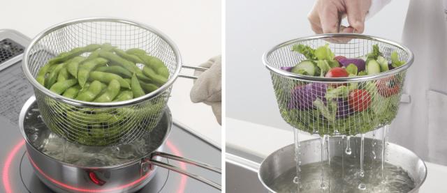 18cmサイズの鍋や揚げ鍋にセットして持ち上げるだけで、簡単に油切り・水切りができる手付きザルです。麺類や枝豆をゆでてそのまま湯切りをしたり、唐揚げやポテトフライを揚げる時にもとっても便利です。アミ目が大きいのでしっかり水気を切ることができます。