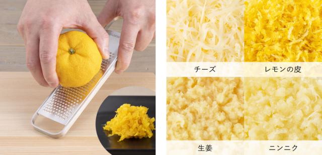 ハードチーズだけでなく、柑橘、生姜、ニンニクなどの日常的に使う食材もおろせるグレーターです。これ一つあれば、いろいろな食材がおろせるので便利です。
