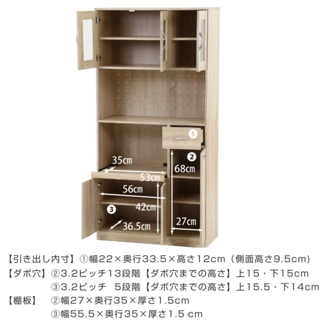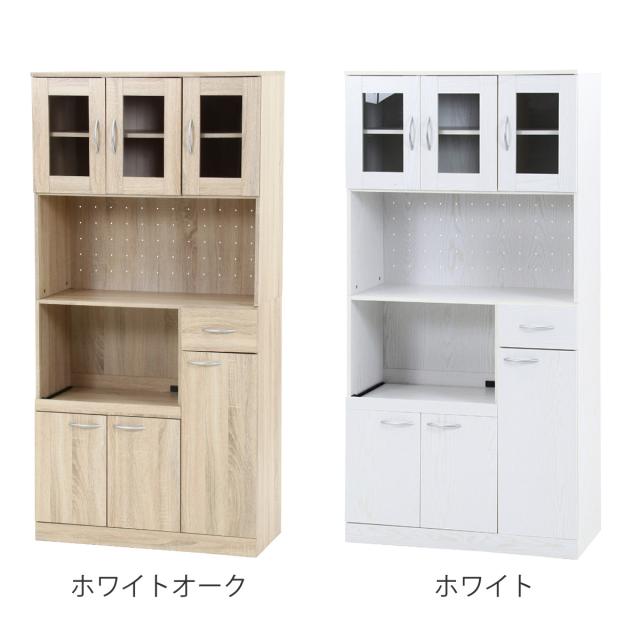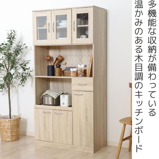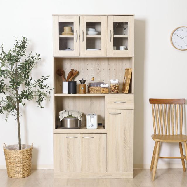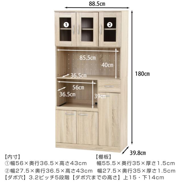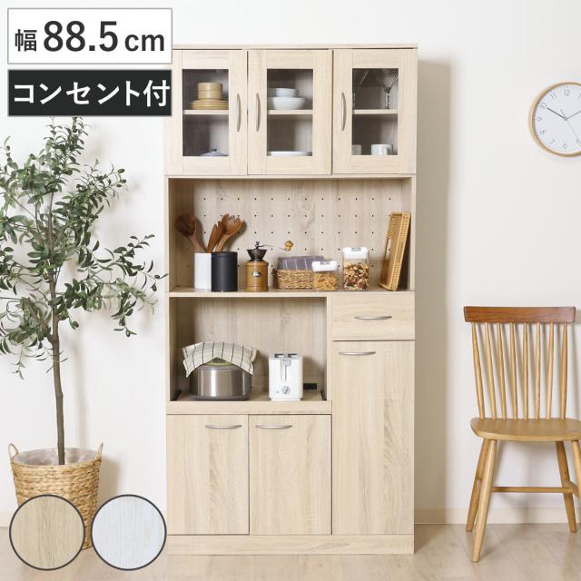 食器棚 ハイキッチンボード 幅88.5cm 木目調 2口コンセント付 ( カップボード キッチンボード 収納 棚 ガラス扉 食器収納 家電収納 レンジラック コンセント付 可動棚 スライド棚 引き出し シンプル )