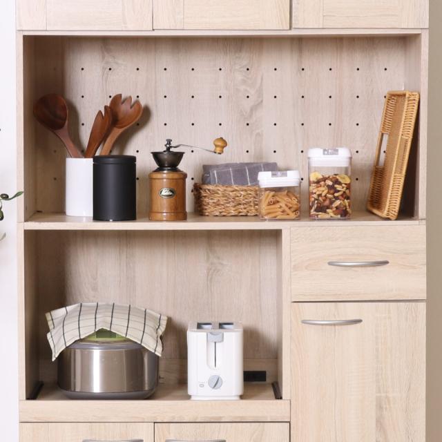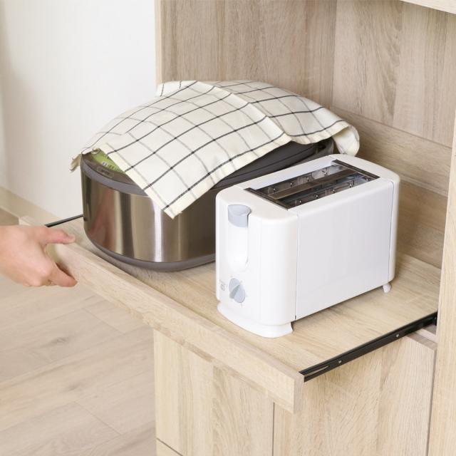 オープンスペースには、使用頻度の高い調理器具などの収納に便利です。スライド棚には、炊飯器や電気ケトルなどを収納できます。スライドレール付きで、家電を置いてもスムーズに出し入れができます。オープンスペースの背面には熱気を逃がす通気穴が付いているので、湿気がこもりません。
