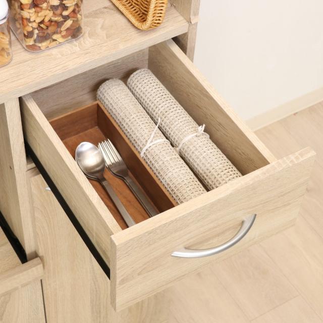 幅22×奥行33.5×高さ12cm(側面高さ9.5cm)の引き出しが付いています。カトラリーなどを収納するのにお使いいただけます。
