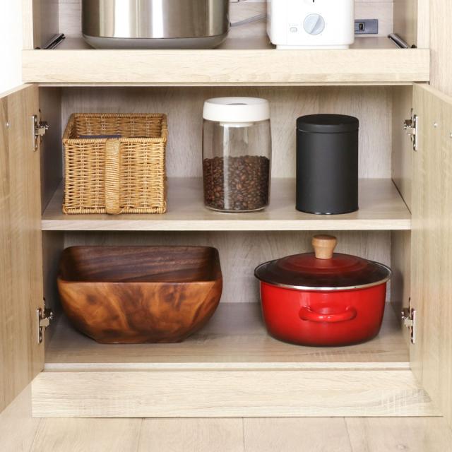 高さ42cmの収納庫です。消耗品や食品ストックはもちろん、深型の鍋やかさばる調理器具の収納にもピッタリです。可動式の棚が1枚付いているので、収納するものに合わせて調整してお使いいただけます。