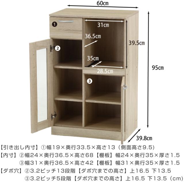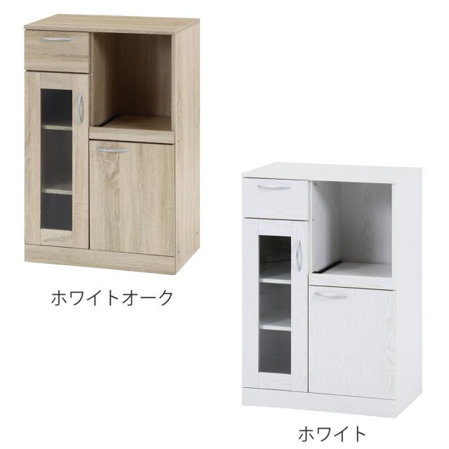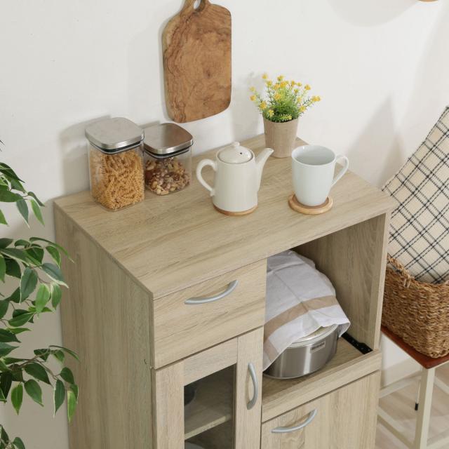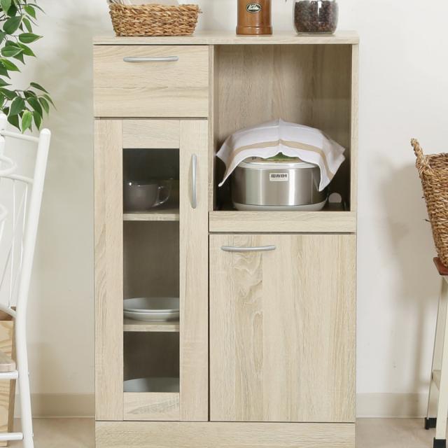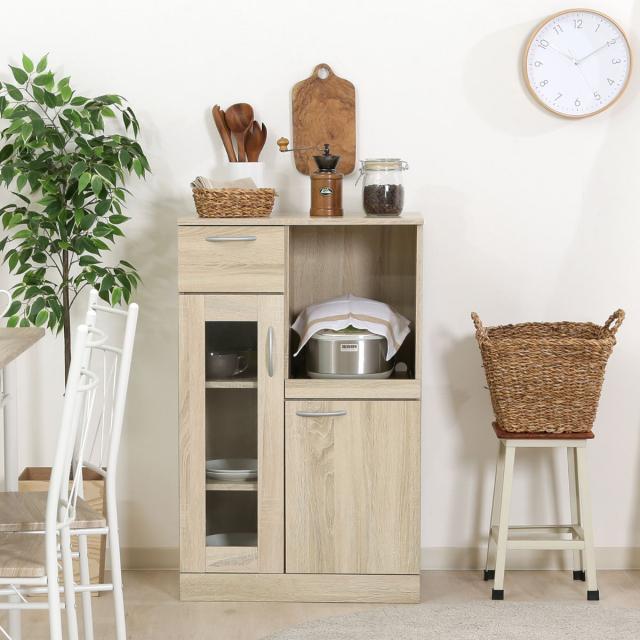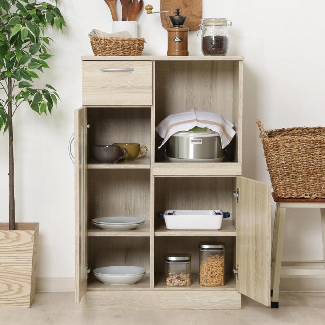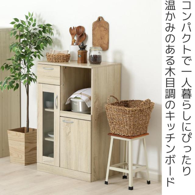 コンパクト 食器棚 幅60cm 木目調 1人暮らし ( カップボード キッチンボード 収納 棚 ガラス扉 食器収納 家電収納 可動棚 スライド棚 引き出し 省スペース シンプル )