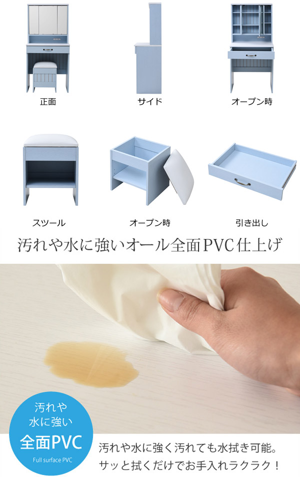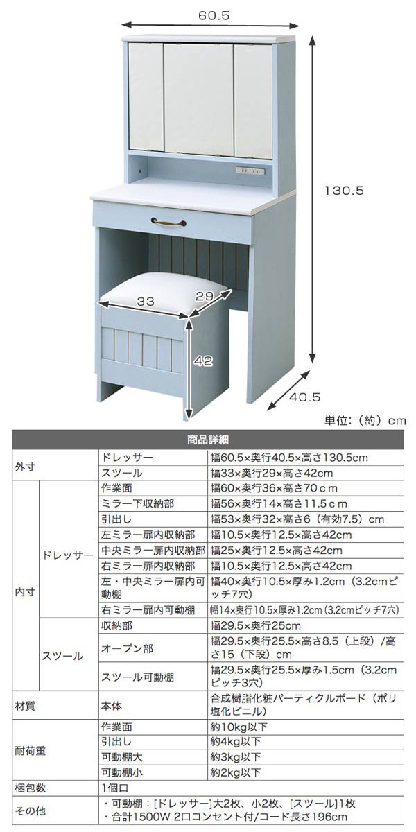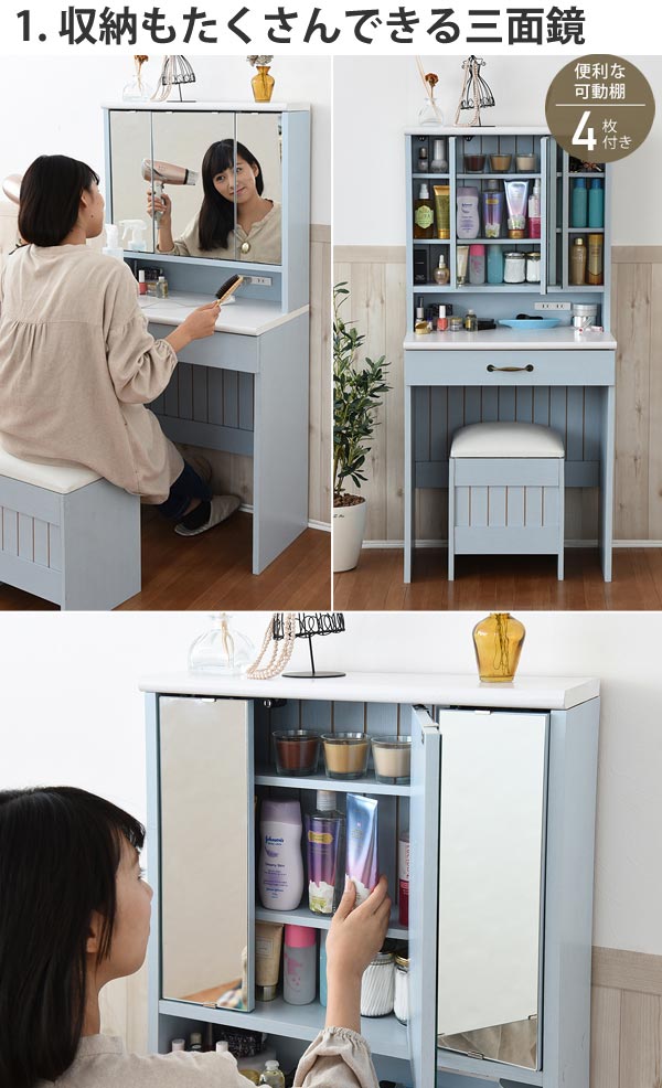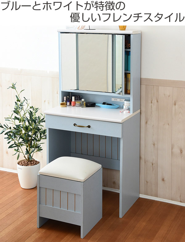 ドレッサー 幅60cm スツール付き 三面鏡 フレンチカントリー ( 鏡台 テーブル デスク コスメテーブル 引き出し 椅子 メイク台 化粧台 2口コンセント 大容量 収納 三面 鏡 化粧品 メイク 椅子付き 化粧 スキンケア 寝室 )