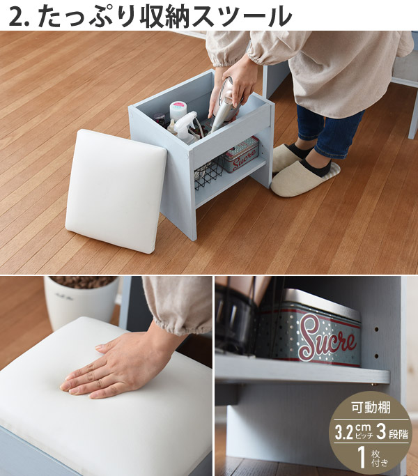 座面はふわふわの快適クッション入りでやわらかな座り心地♪うれしいスツール付きのドレッサーです。スツールは収納もでき、背の高いボトルやドライヤーなどもラクラク収納できます。また可動棚も付属しています。