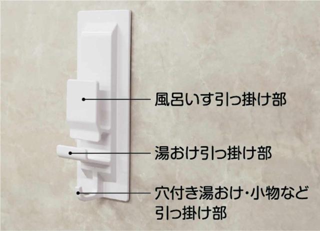 湯おけにフック穴がなくても、フチに引っ掛けて収納できるので、いろんなタイプの湯おけを掛けることができます。