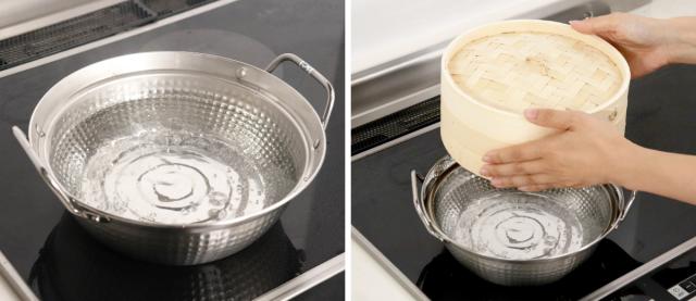 1.せいろを水でぬらします。せいろ全体がしっかりと水でぬれた状態にし、その後さっと水気を切ってください。