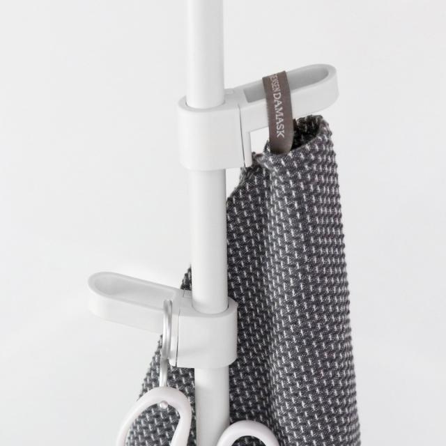 別売りの縦つっぱり棒に取り付けて使えるフックです。布巾やミトンの収納にぴったりです。玄関に設置すると、帽子やペットのリードなどお散歩グッズを掛けて使えます。