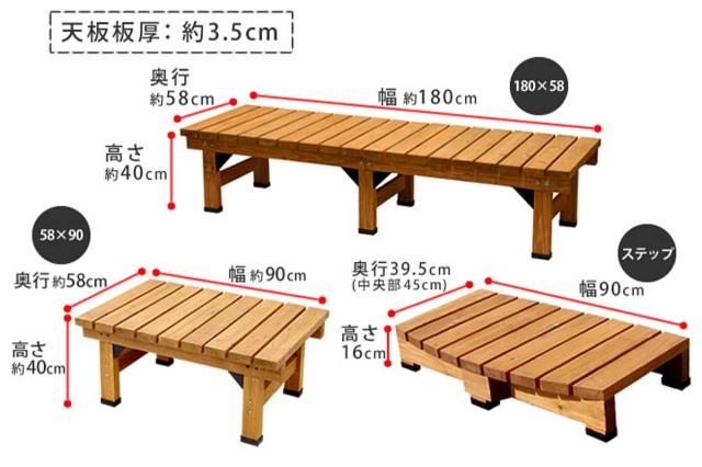 | サイズ | デッキ縁台(幅180):幅 約180×奥行58×高さ40cm 約19.5kg デッキ縁台(幅90):幅90×奥行58×高さ40cm 約12kg ステップ:幅 約90×奥行39.5(中央部 約45)×高さ16cm 約8kg |