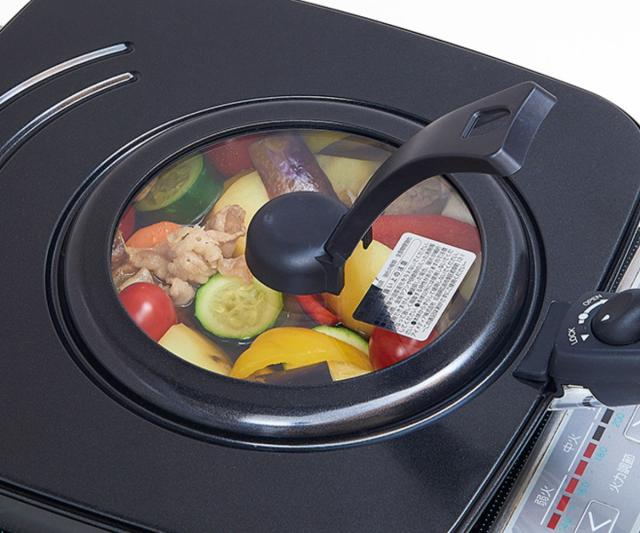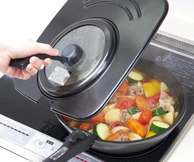 料理中はフタを開けなくても中の様子を見ることができます。食材の火の通り具合や裏返すタイミングがひと目でわかるので、おいしいタイミングを逃さず調理ができます。材質は強化ガラスで丈夫で安心です。