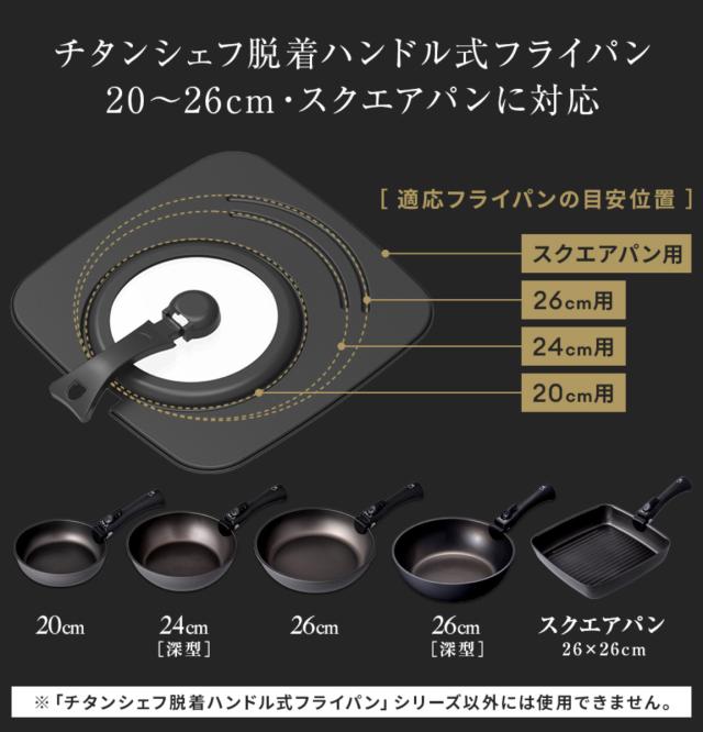 | 備考 | チタンシェフ脱着ハンドル式フライパンの丸型20〜26cm、角型26cmに対応したフライパンカバーです。 |