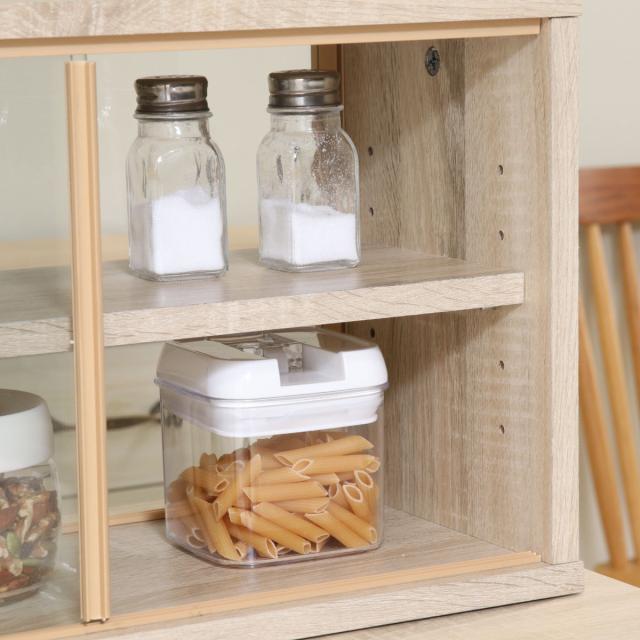 調味料やコップなどの収納物に合わせて高さを調節出来る可動棚付きです。スペースを無駄にすることなく収納できます。