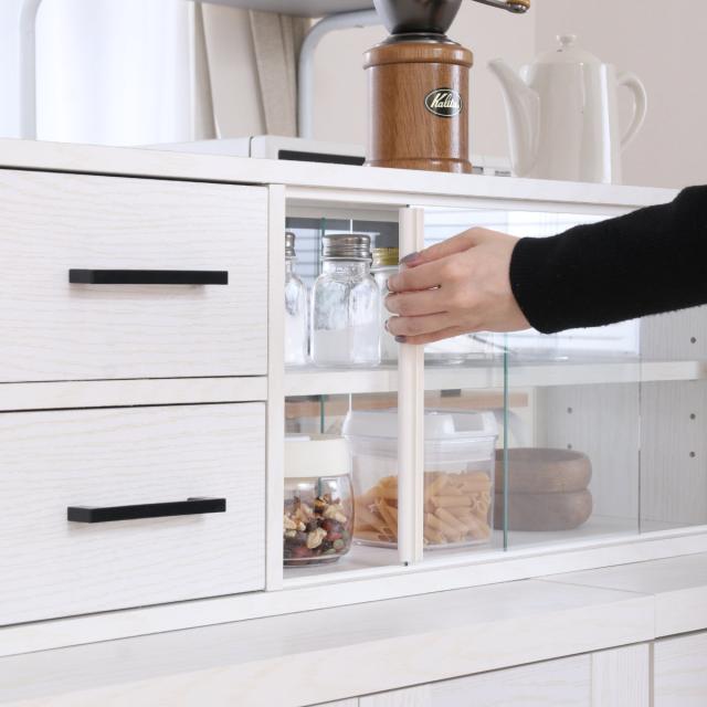 ガラス扉付きなので油やホコリから収納物を守ります。