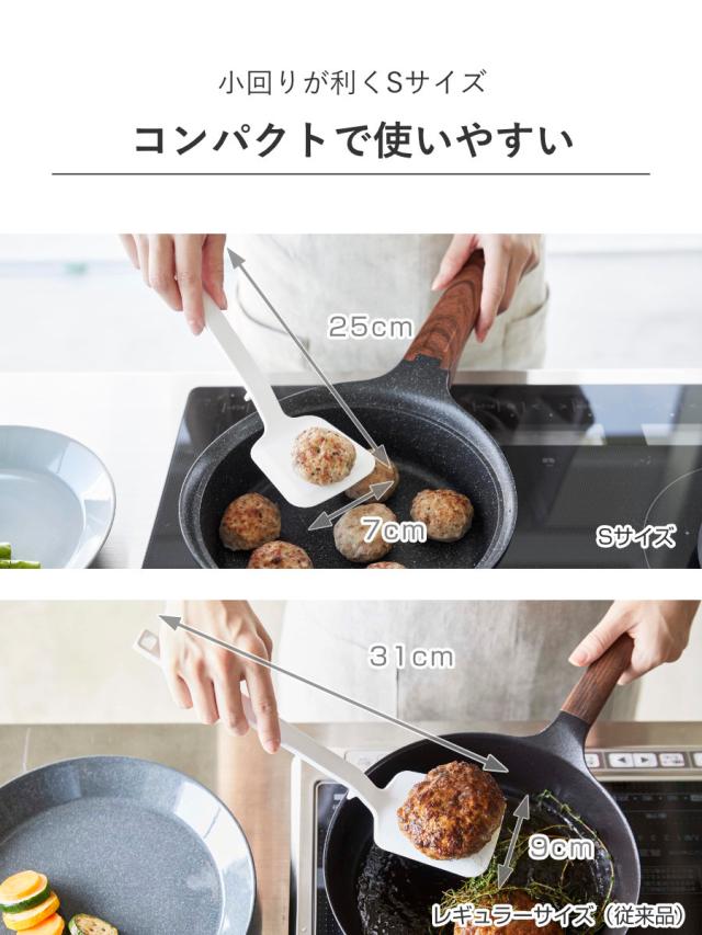 従来製品よりもコンパクトなので、小さめのフライパンでも食材を返しやすいのがポイントです。大きなハンバーグやお好み焼きなどにはレギュラーサイズがおすすめです。