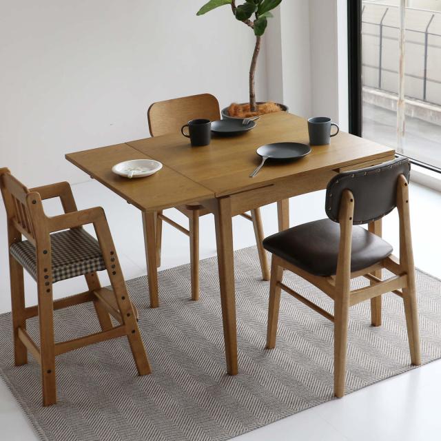 どこか懐かしさを感じるソフトヴィンテージ風に仕上げたダイニングテーブルです。三段階の伸縮式なので、暮らしやシーンに合わせて調整できます。