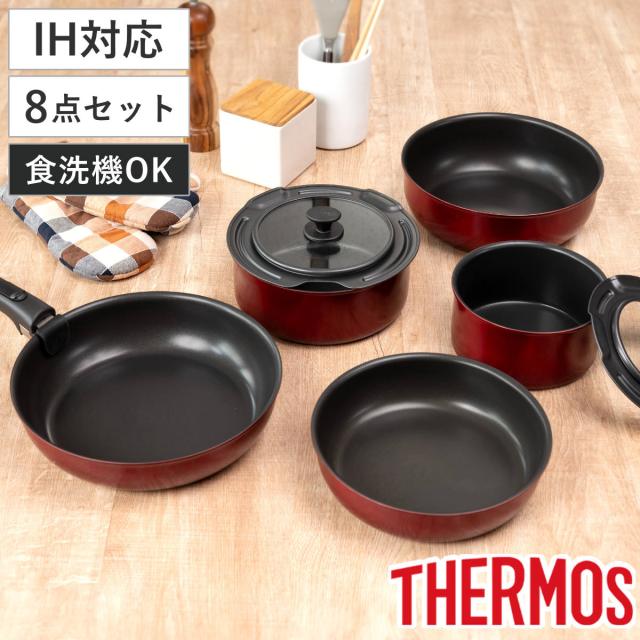 サーモスの、フライパン22cm・フライパン26cm・深型炒め鍋24cm・鍋16cm・鍋18cm・鍋フタ2種・取り外しのできる専用取っ手の8点セットです。炒める・煮る・焼くの基本的な調理ができます。IHにも対応しています。