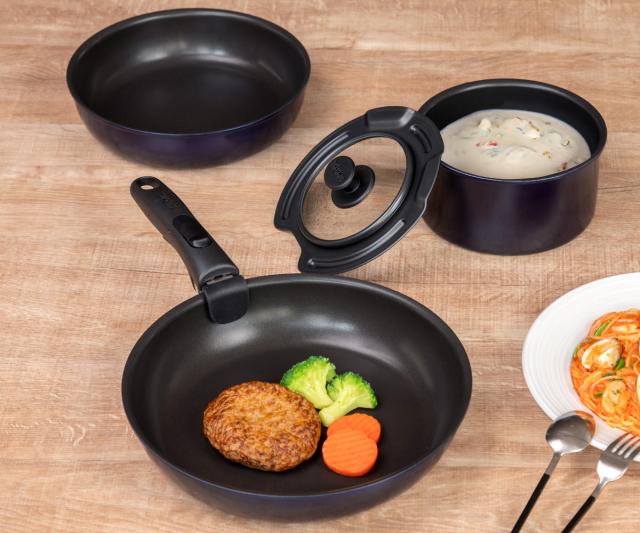 | 材質 | 【フライパン・鍋】 本体:アルミニウム合金 はり底:ステンレス鋼(クロム13%) 内面:ふっ素樹脂塗膜加工、外面(底面を除く):焼付け塗装 【鍋蓋】アルミニウム合金(焼付塗装)、強化ガラス 【専用取っ手】フェノール樹脂 |