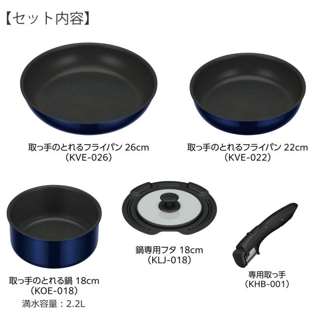 | 内容量 | 1セット(フライパン22cm・26cm・鍋18cm・鍋蓋・専用取っ手) |