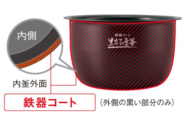 ●発熱効率を高めた「鉄器コート黒まる厚釜」は、釜内の炊きムラを抑えます。