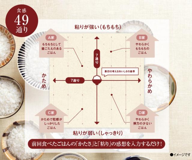 お米は、同じ銘柄でも収穫する産地や気候の変動によって食感が微妙に変わります。わが家炊きは、水の量を変更せず、前回食べたごはんの味の感想をアンケートに回答するだけで、炊き方を微調整し炊くたびに好みの味に進化します。