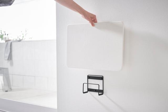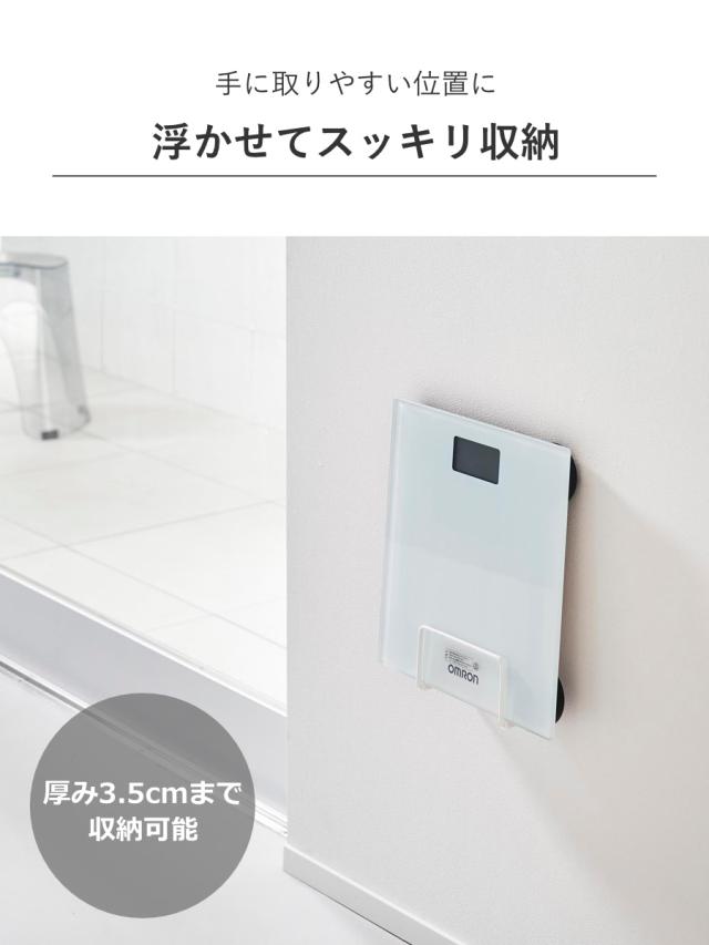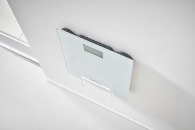 置き場所に困る体重計を浮かせて収納できるウォールラックです。手に取りやすい位置に石こうボードピンで簡単に設置できます。浮かせて収納できるので掃除もラクラクです。