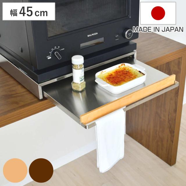 サビに強くお手入れのしやすいステンレス製のオーブンレンジラックです。前面板に南魚沼産木材を使い、木目のあたたかみをプラスした、キッチンに馴染みやすいデザインです。引き出し式のスライドテーブルで、調理器具やお皿をちょっと置きできる作業スペースを確保できます。