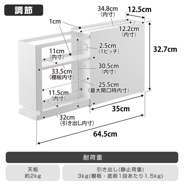 | サイズ | 幅12.5×奥行35〜64.5×高さ32.7cm 内寸 天板:幅12.2×奥行34.8×高さ1cm 引き出し:幅11.5×奥行32×高さ30.5cm 棚板:幅11×奥行33.5×高さ1cm(棚板は2.5cmピッチで高さ調節可能) |