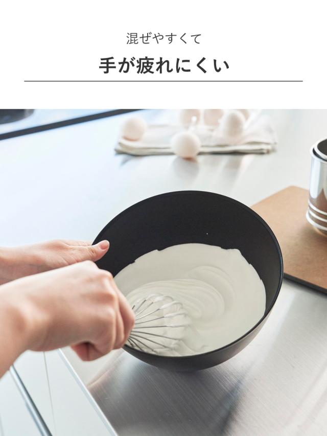 ボウルを倒した時に斜めをキープできる構造で、食材が混ぜやすく手が疲れにくい調理ボウルです。料理の下ごしらえからお菓子作りなど毎日使う調理ボウルだからこそ使いやすさを追求しました。
