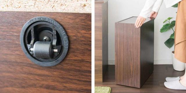 底面4か所に、360度回転してスムーズに動かせるキャスターを設置しています。細かいゴミを捨てたい時、お掃除やゴミ回収の際もサッと移動できます。外側から見えない隠しキャスターなのでインテリア性も損ないません。