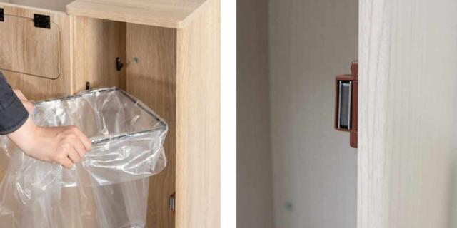 ゴミ袋を固定するリング付きで、袋の取り付けも簡単です。しっかり固定されるので、ゴミをたくさん入れても安心です。また、前扉の開閉は開けやすくしっかり閉まるマグネット式で、袋の出し入れがラクラクです。