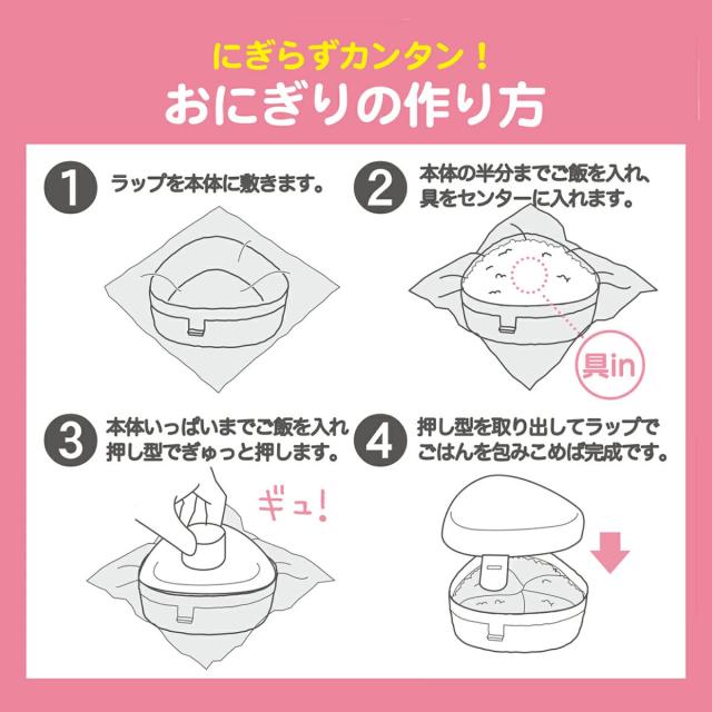 コンビニおにぎりの約2倍サイズの大きなおにぎりが簡単に作れるケースです。ラップを使って、手を汚すことなく簡単におにぎりが作れます。