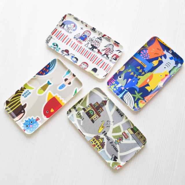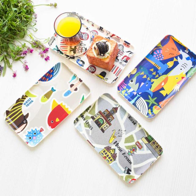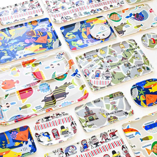 かわいいイラストの布貼り加工が施されたトレイ