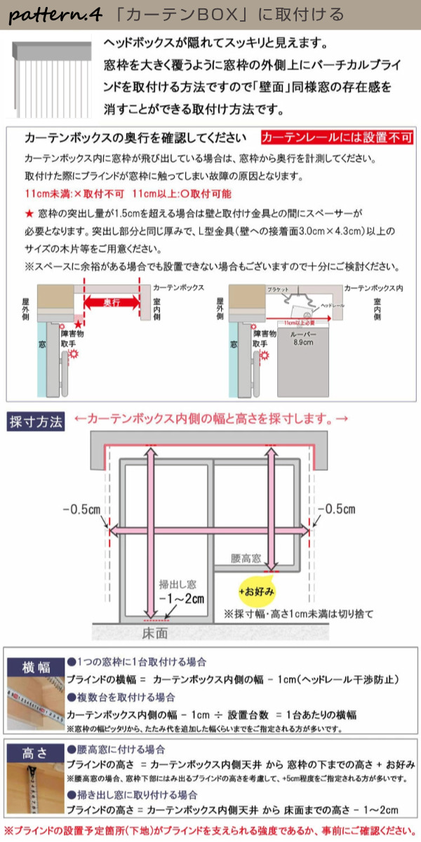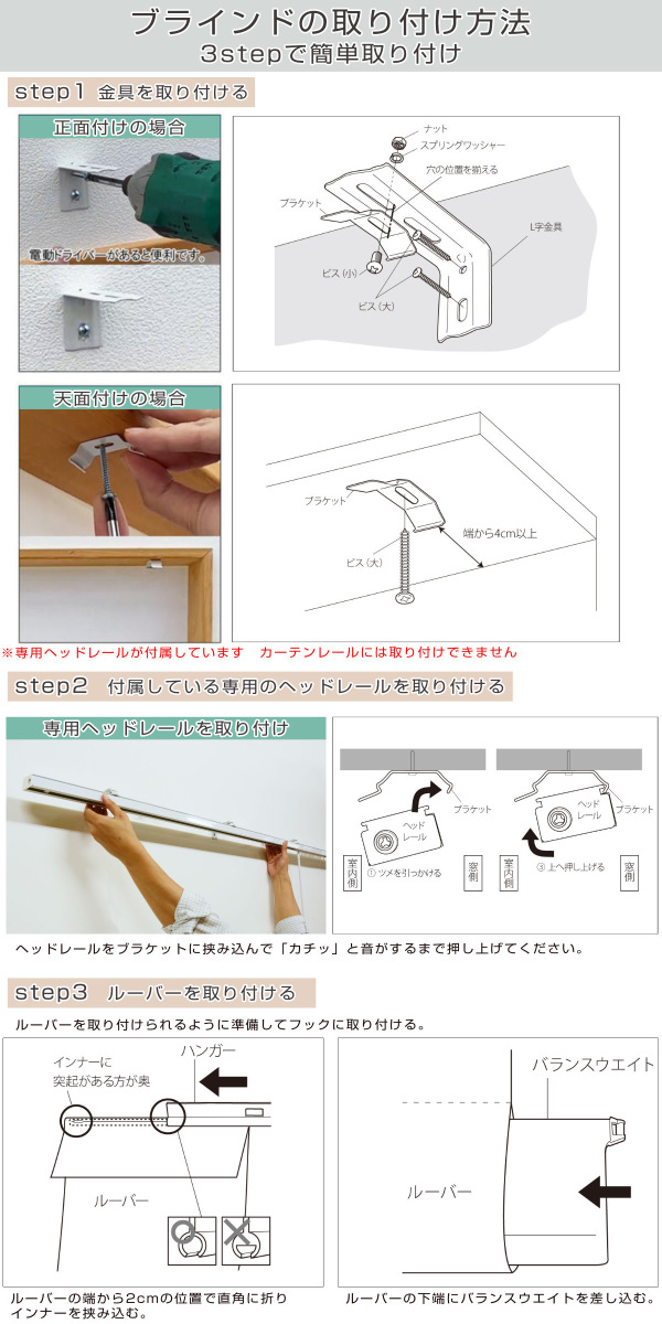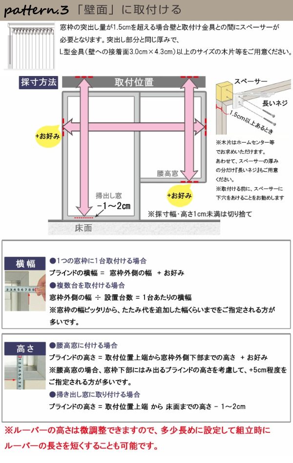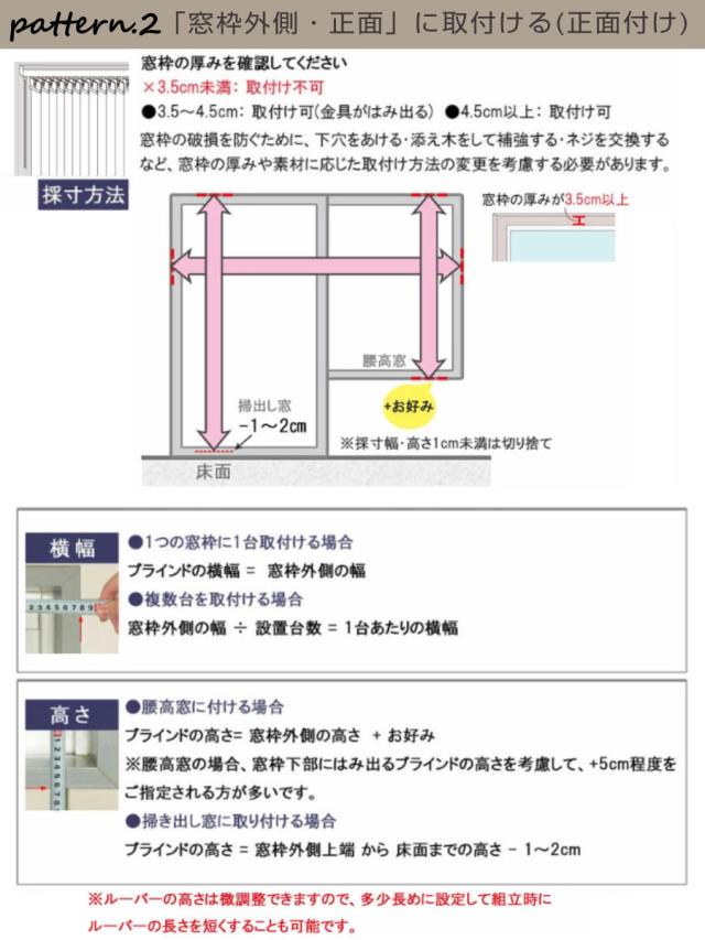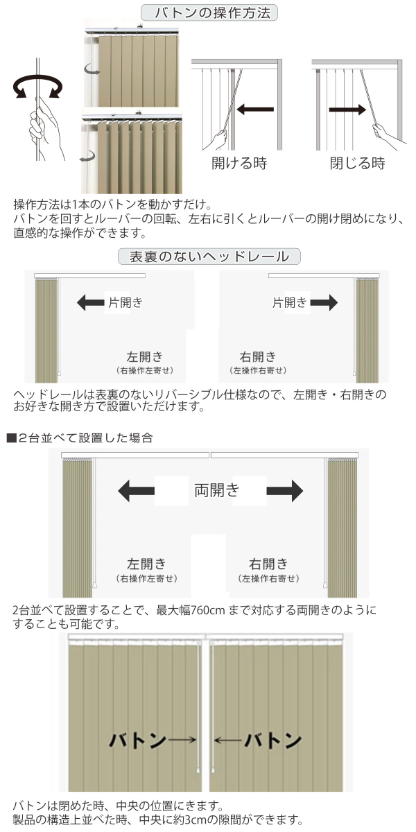 | 備考 | ※操作バトンの長さは製品幅によって異なります 幅が異なるブラインドを組み合わせる場合、バトンの長さが揃わない場合がございますが予めご了承ください 幅140cm以下:バトンの長さ104cm 幅141cm以上:バトンの長さ124cm |