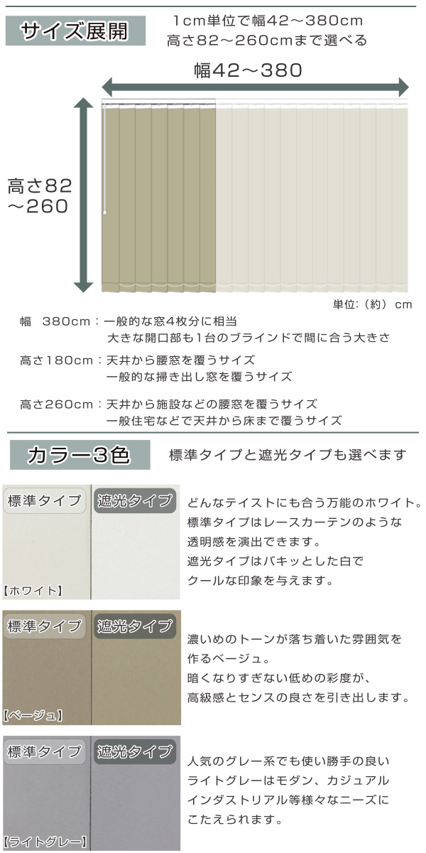 ![]() バーチカルブラインド 遮光タイプ 幅261〜320cm 高さ181〜260cm | ![]() バーチカルブラインド 遮光タイプ 幅321〜380cm 高さ181〜260cm 【▲このページの商品】 |