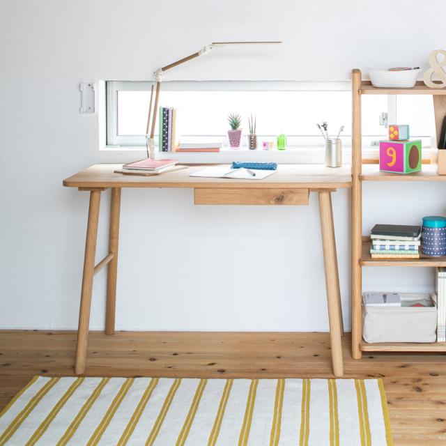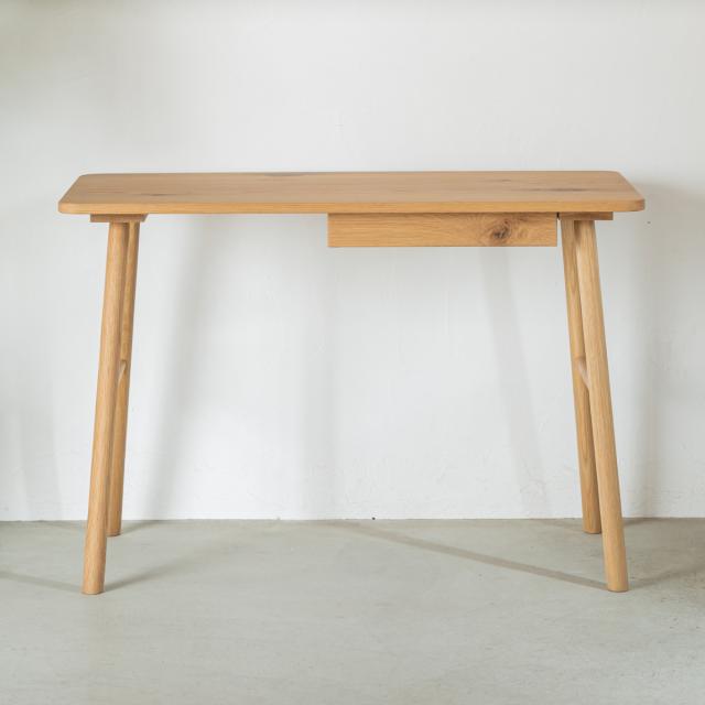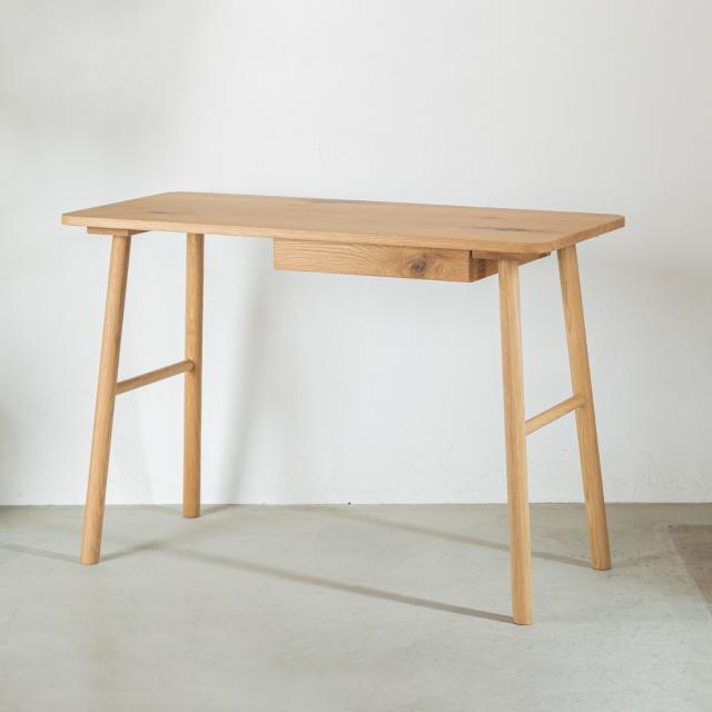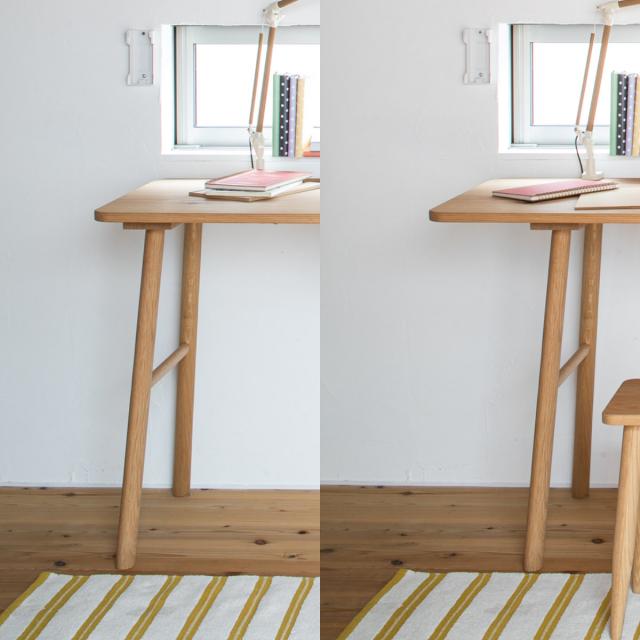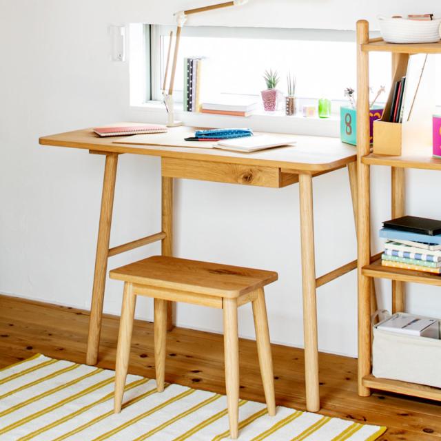 温かみのあるオーク無垢材を贅沢に使用したデスクです。お部屋のちょっとしたスペースに収まるコンパクトなサイズ感なのでキッチン横のスペースなどに設置でき、お子様の学習を見守ることができます。左側の脚を内側に移動が可能です。シンプルなデザインのため、年齢や性別を問わずお使いいただけます。