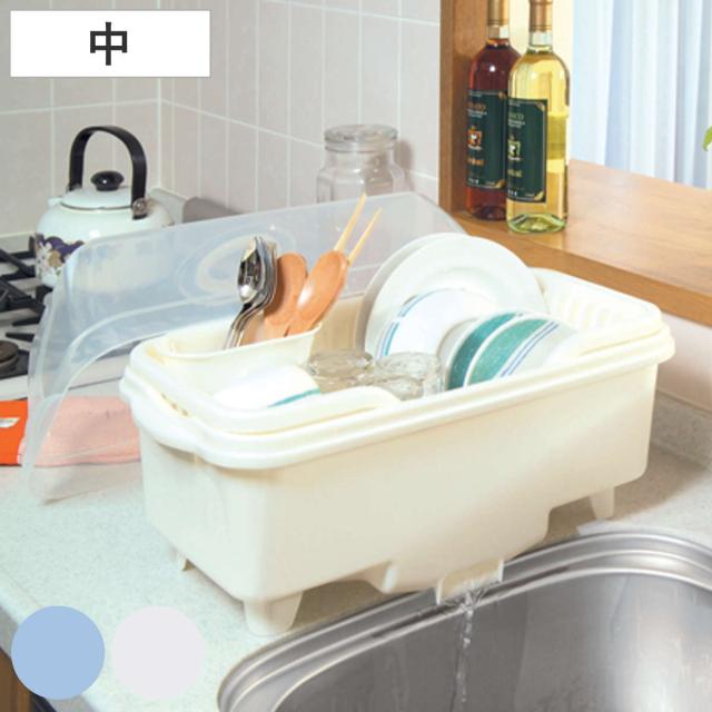 水切りカゴ 皿立て 水切り 流 フード付 中サイズ ( 水切りラック 水切りかご 洗い桶 シンク上 水切りバスケット フード付き フタ付き 蓋 カバー 洗い物 食器 洗い 収納 乾燥 ラック 水が流れる スリム コンパクト カトラリー )