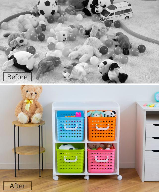 4つのカラフルなバスケットが入った2段のバスケットラックは、お子様のお片付け習慣をサポートします。色で分けて収納するものを決められるので、小さなお子様でも覚えやすく、ゲーム感覚で楽しくお片付けの習慣が身に付きます。フタのないシンプルな形状のバスケットで、お子様が自分でおもちゃを片付けやすくなっています。