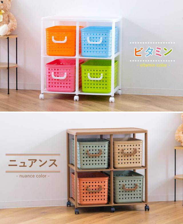 バスケットラックは、明るいカラフルな色合いで子供部屋にもピッタリな「ビタミン」と、くすみカラーで落ち着いた「ニュアンス」の2カラー展開しています。お部屋の雰囲気や、お好みに合わせてお好きなカラーをお選びいただけます。